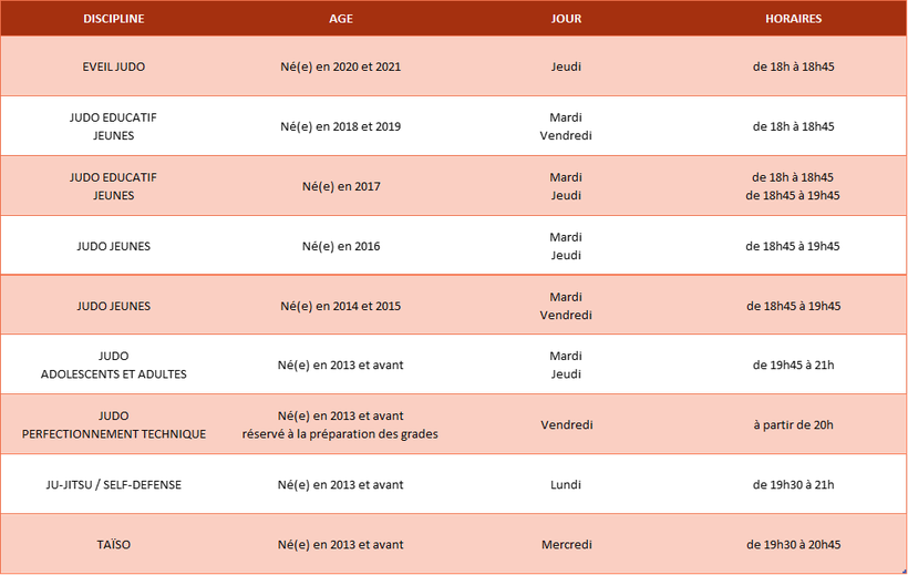 Planning et Horaires des cours